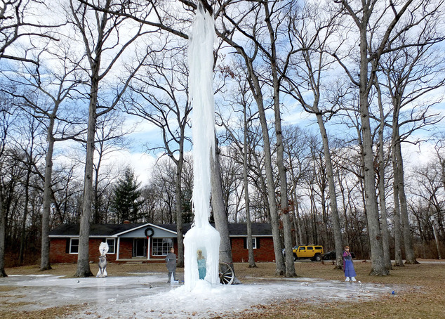 A 45-foot icicle in the city of St. Elmo, in Fayette County, Illinois, has Frozen fans and non-fans, (the non-fans are those who are tired of the song “Let It Go”), smiling.